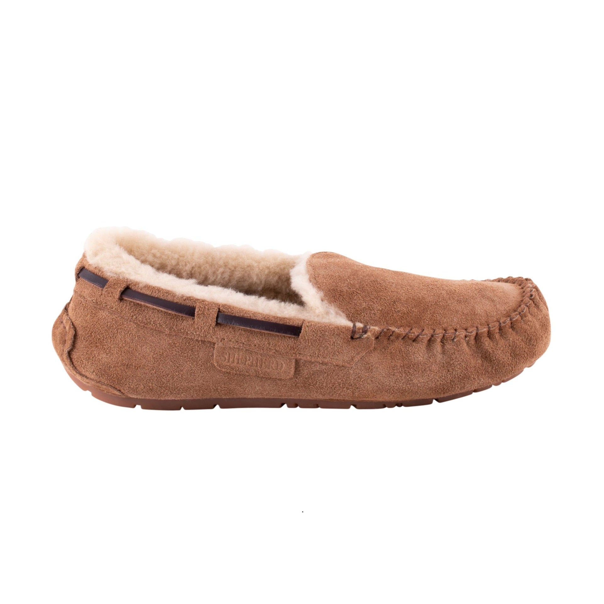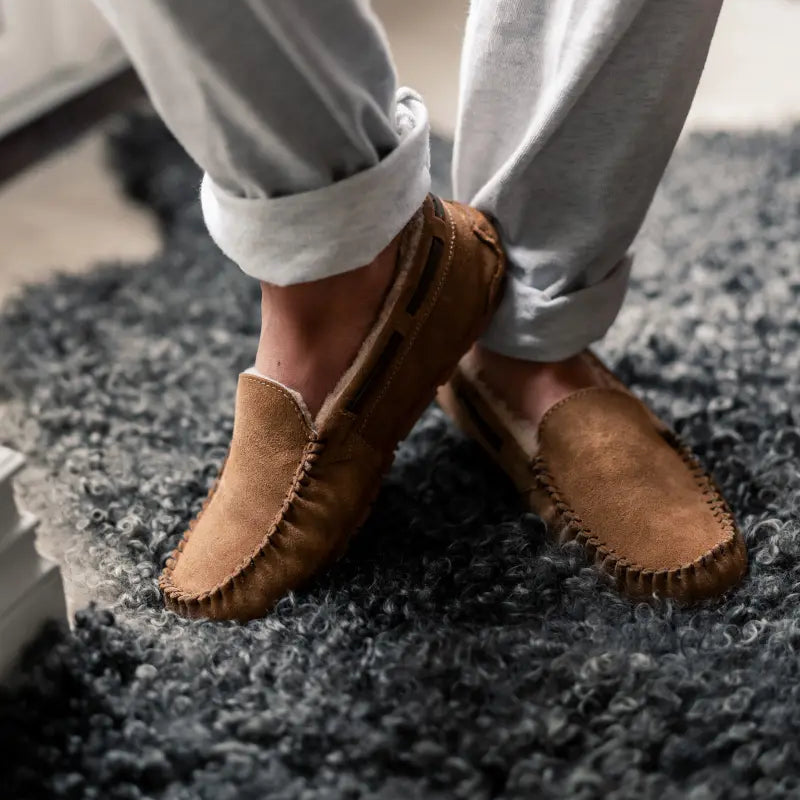 Mirre toffel är ett par exklusiva tofflor som kombinerar högkvalitativ mocka med en insida i mjukt fårskinn, vilket skapar en oöverträffad nivå av komfort och värme. Deras klassiska mockasinmodell ger dem en tidlös och stilren design, perfekt för både avslappnade stunder hemma och mer formella tillfällen.