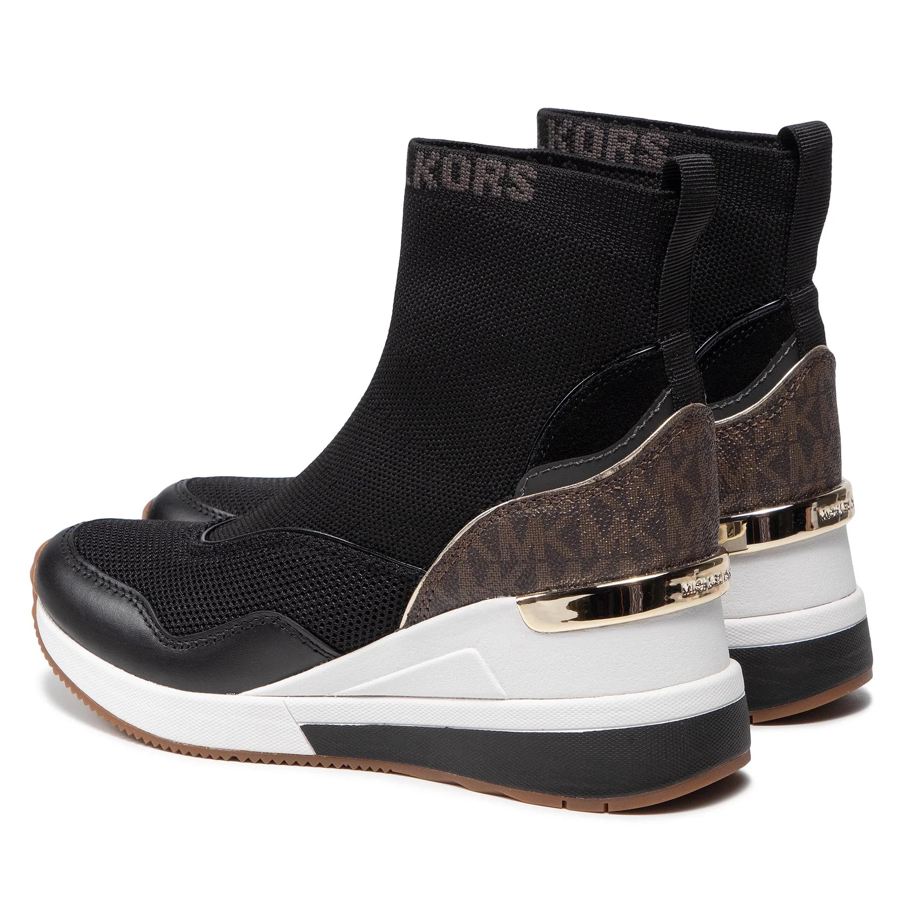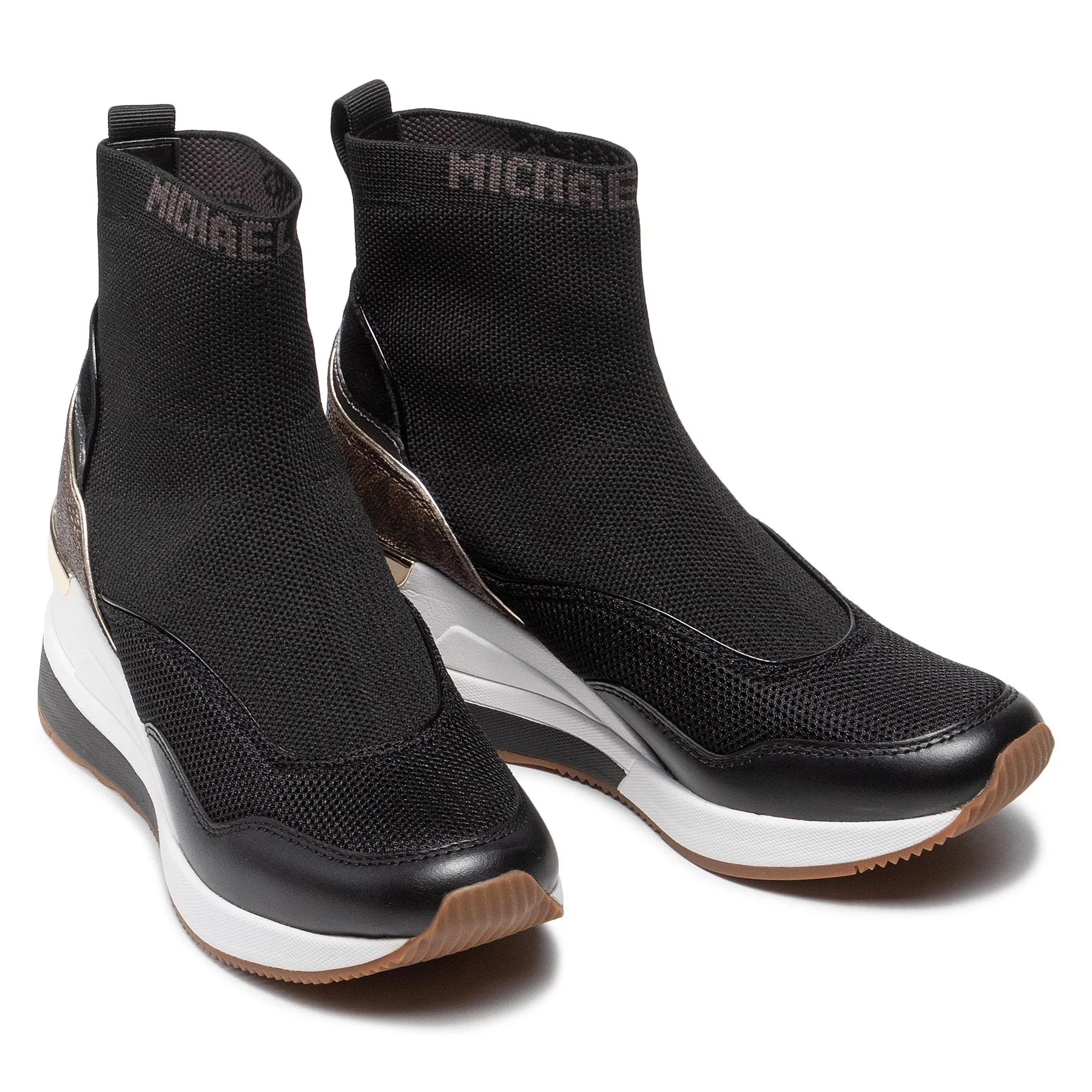 Michael Kors Swift Bootie är en stilfull strumpsko tillverkad av textil med en bekväm kilklack. Denna moderna stövlett kombinerar trend och komfort på ett unikt sätt. Den har en innovativ design med läderdetaljer och en mönstrad MK-hälkappa, vilket ger skon ett distinkt och igenkännligt utseende som är karakteristiskt för Michael Kors.