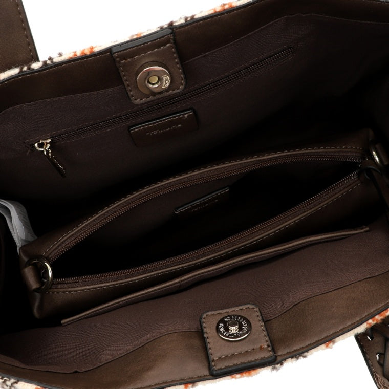 Invändigt finns två praktiska fickor – en öppen och en med dragkedja – som gör det enkelt att organisera dina tillhörigheter. Dessutom har väskan ett mittfack med dragkedja för extra säker förvaring. Väskan har även en ytterficka på baksidan med dragkedja, perfekt för värdesaker.